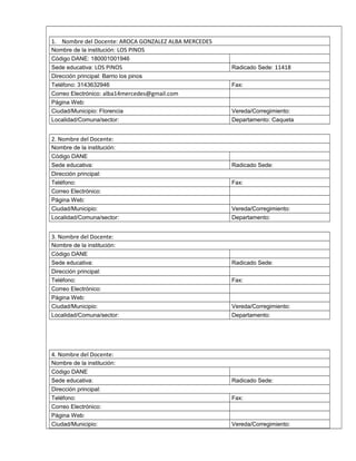 Este documento presenta un formulario para registrar proyectos de aula con TIC. El formulario recopila información sobre los docentes involucrados, la planeación del proyecto, su desarrollo, resultados y evidencias. El objetivo es guiar al formador en la consolidación de experiencias de proyectos de aula que integren las tecnologías.