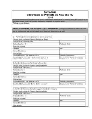 Este documento presenta un formulario para documentar proyectos de aula con TIC desarrollados por docentes de la institución Nuestra Señora de Belén en Cúcuta, Colombia. Describe el proyecto de aula llevado a cabo por seis docentes con estudiantes de grados 2° a 5° para motivar la lectura y desarrollar competencias lingüísticas a través del uso del programa Pancho y su máquina de cuentos. Incluye la planeación, desarrollo y evaluación del proyecto, así como las actividades realiz