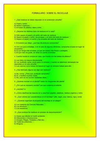 Este documento contiene un cuestionario sobre las prácticas de reciclaje. Pregunta sobre los tipos de residuos que se depositan en cada contenedor, cómo clasifican los residuos en casa, qué tipo de productos prefieren comprar, qué hacen con las bolsas de plástico y si han fabricado algo con residuos. También pregunta sobre quiénes reciclan en la escuela, por qué es necesario reciclar, cómo clasifican las basuras en casa y los colores característicos del reciclaje. Finalmente, pregunta quiénes organizan