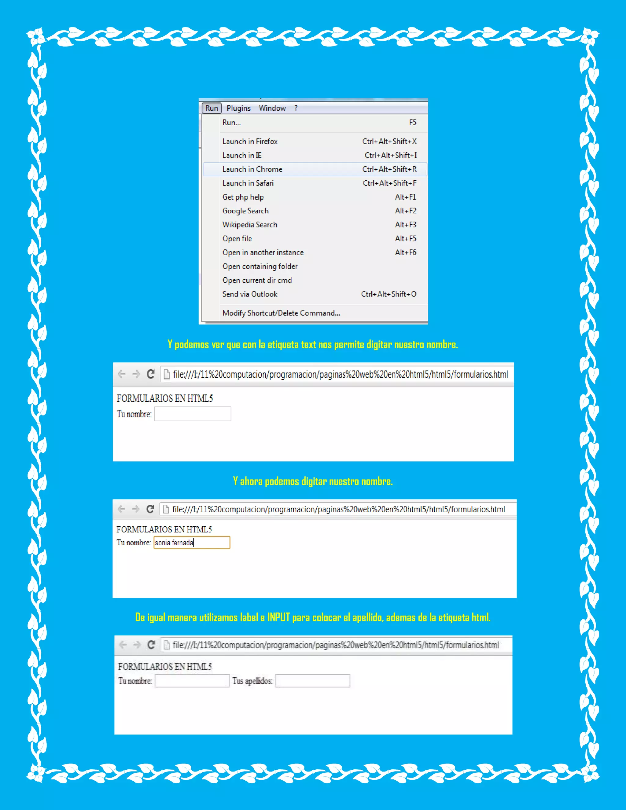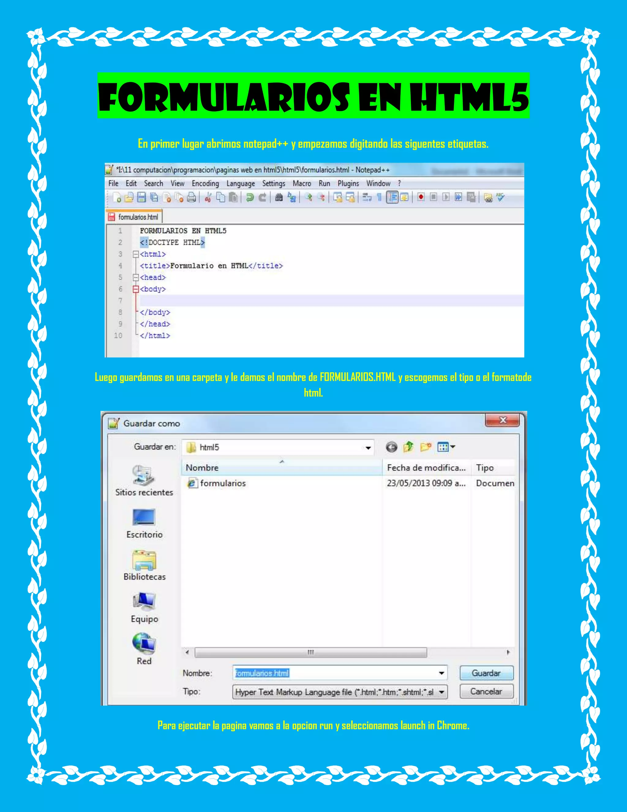 El documento describe cómo crear un formulario HTML5 básico con diferentes tipos de campos como texto, lista desplegable, botones de radio, archivos y botón de envío. Explica cómo agregar etiquetas como <label>, <input>, <select>, <option> y <button> para crear cada campo y añadir la etiqueta <form> para agruparlos. También cubre cómo agregar atributos como type, name y required para especificar el tipo de campo y validaciones.