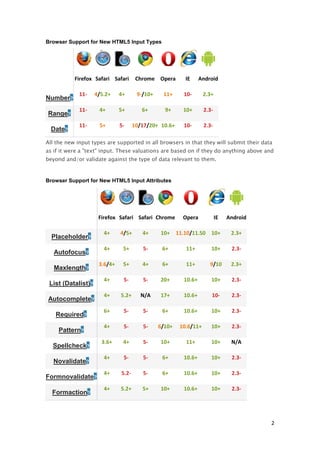 Nuevos elementos y atributos de formularios HTML5 facilitan la creación de formularios y mejoran la experiencia del usuario. HTML5 introduce elementos como progress, meter, output y datalist, así como 13 nuevos tipos de entrada como tel, email y color. También añade atributos como placeholder, required y pattern. La compatibilidad con navegadores varía, pero está mejorando rápidamente con el tiempo. Modernizr ayuda a detectar el soporte del navegador para las características de HTML5 y facilita el uso de soluciones alternativas cuando no son compatibles.