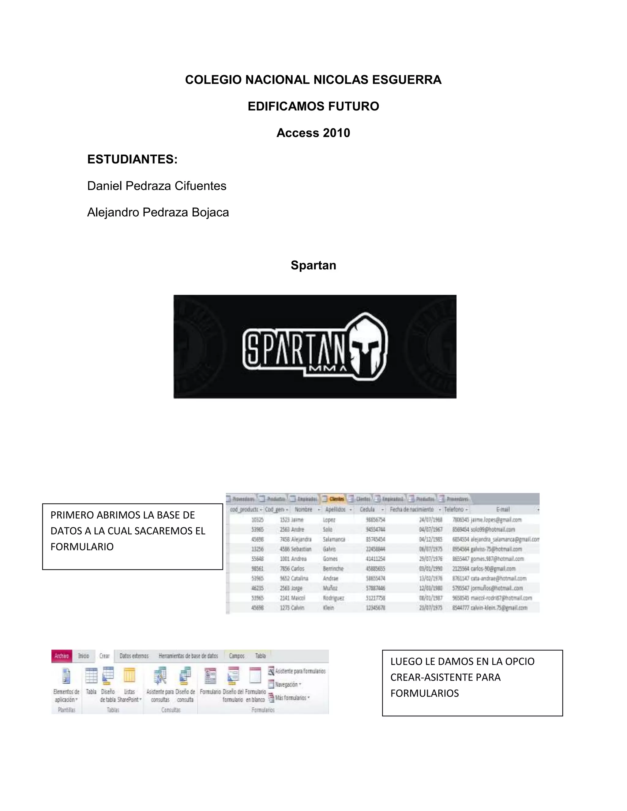 El documento proporciona instrucciones en 3 pasos para crear un formulario en Access 2010 a partir de una base de datos: 1) Abrir la base de datos, 2) Seleccionar la opción "Crear asistente para formularios" , 3) Hacer clic en "Siguiente" dos veces y luego "Finalizar" para completar el formulario con los datos respectivos de la tabla. Este proceso debe repetirse para cada tabla en la base de datos.