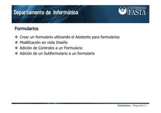 Este documento presenta información sobre la creación y uso de formularios en Microsoft Access. Explica cómo crear formularios utilizando el Asistente para formularios, modificarlos en la vista Diseño, y agregar diferentes tipos de controles como cuadros de texto, casillas de verificación y subformularios. También describe las secciones, propiedades y funcionalidades de los formularios como agrupar campos, validar datos y personalizar la apariencia.