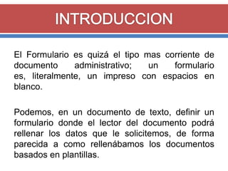 Este documento explica cómo crear formularios interactivos en Microsoft Word utilizando controles de formulario. Describe los pasos para agregar y configurar diferentes tipos de controles como texto, lista desplegable, casilla de verificación y fecha. También cubre cómo proteger el documento para que solo se pueda rellenar el formulario y guardarlo como plantilla.