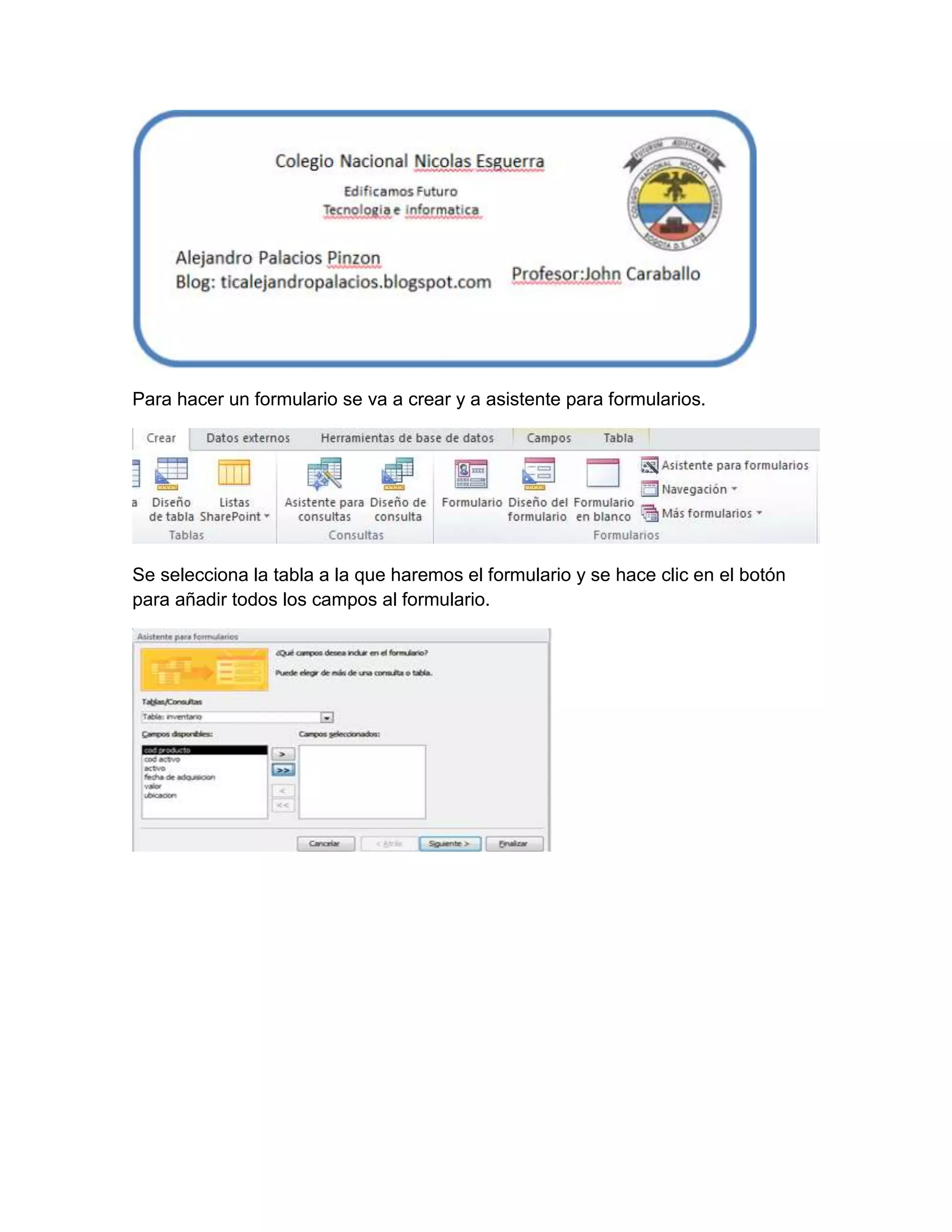 Para crear un formulario para una tabla, se selecciona la tabla y se agregan todos sus campos al formulario haciendo clic en un botón. Luego, se configura el diseño del formulario en columnas y se finaliza. Después, se puede modificar el diseño del formulario en la vista de diseño. Este proceso se repite para cada tabla requerida.