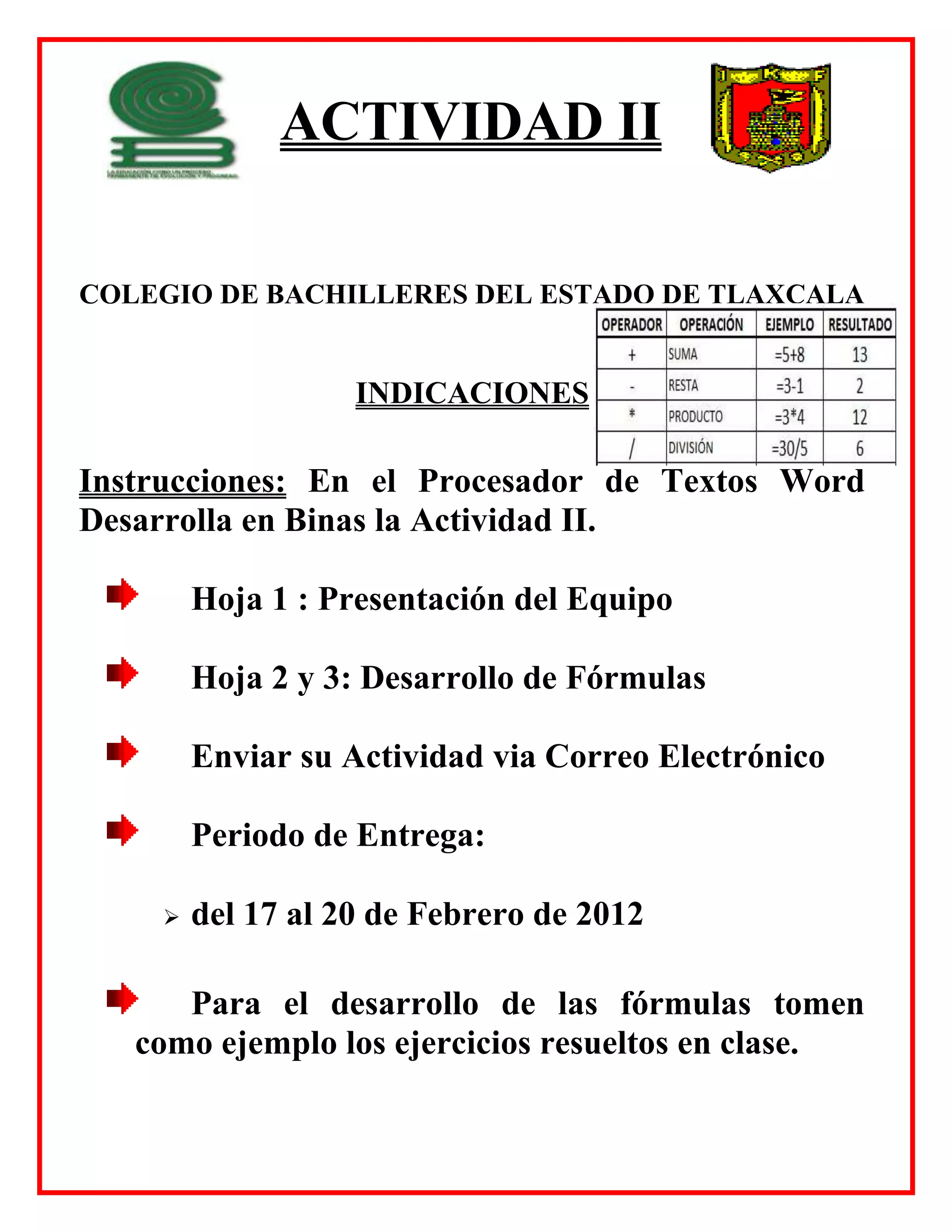 Este documento proporciona instrucciones para completar la Actividad II para un curso de bachillerato. Indica que los estudiantes deben desarrollar fórmulas matemáticas en hojas separadas y enviar su tarea por correo electrónico entre el 17 y el 20 de febrero de 2012. Proporciona ejemplos de fórmulas matemáticas que los estudiantes deben resolver como parte de la actividad.