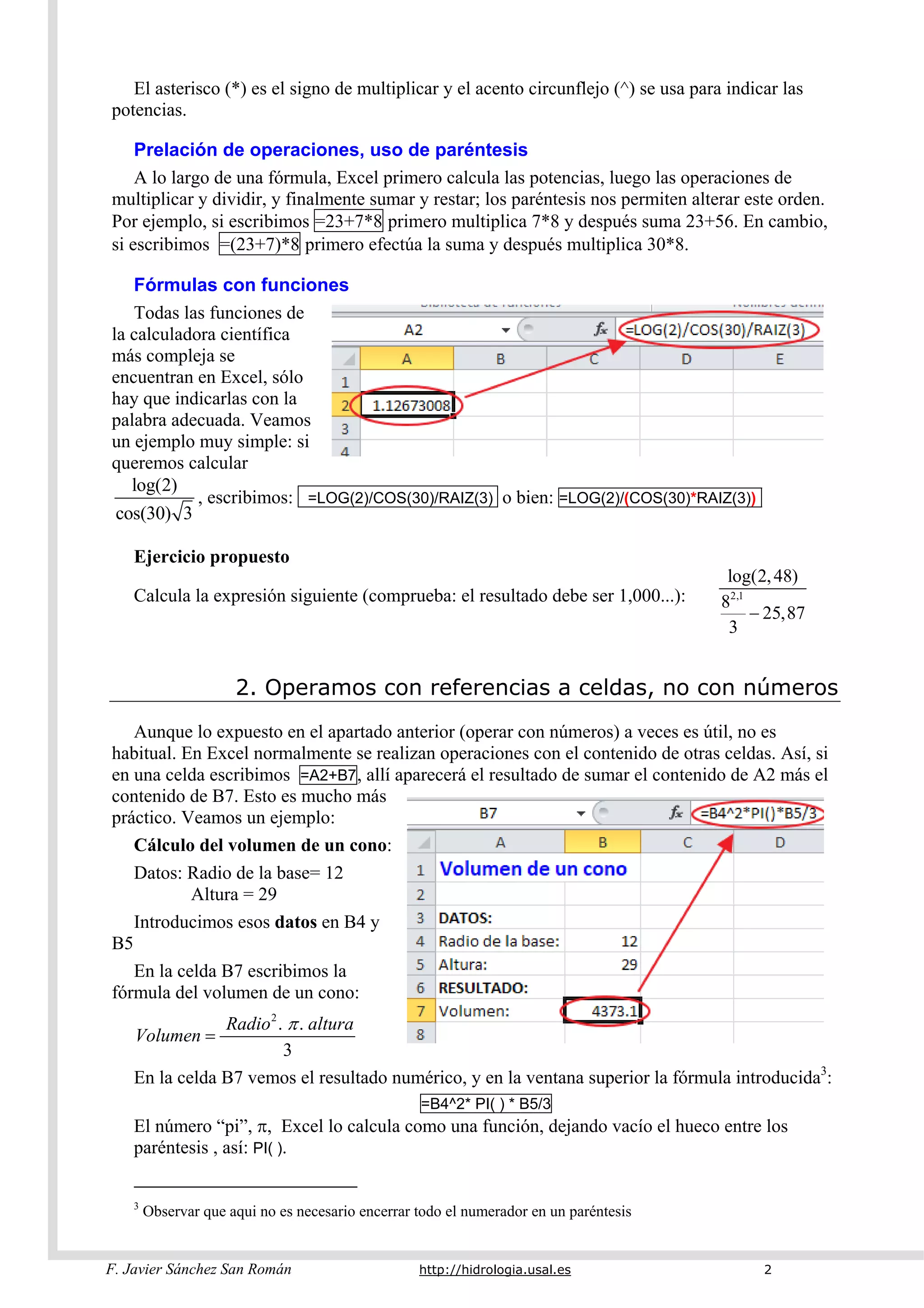 El documento explica el uso de fórmulas en Excel. Primero, describe los tres tipos de datos que se pueden escribir en una celda: texto, números y fórmulas. Luego, ofrece ejemplos de cómo escribir fórmulas simples y complejas, utilizando funciones matemáticas y lógica de precedencia de operadores. Finalmente, explica cómo crear fórmulas que se refieran a rangos de celdas y cómo extender fórmulas a múltiples celdas de manera automática.