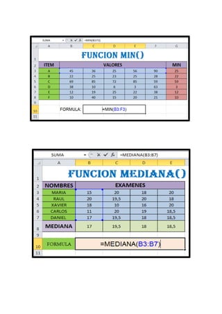 Este documento presenta varias funciones de Excel como CONTAR, CONTAR.SI, MAX, MODA, BUSCARV y BUSCARH y ofrece ejemplos de sus usos. Incluye tablas de datos de actividades domésticas y ventas de productos para ilustrar cómo calcular la cantidad de veces que aparece un nombre usando CONTAR.SI, encontrar el máximo valor en un rango o tabla usando MAX, y determinar el producto más vendido usando MODA. Finalmente, muestra cómo buscar un valor específico en un rango usando BUSCARV y encontrar texto en una tabla