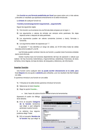 Este documento explica qué son las fórmulas en Excel, incluyendo ejemplos de fórmulas comunes y sus componentes. Las fórmulas realizan cálculos utilizando valores de celdas, constantes, operadores y funciones predefinidas. El documento también describe cómo insertar funciones en Excel usando el asistente de funciones.