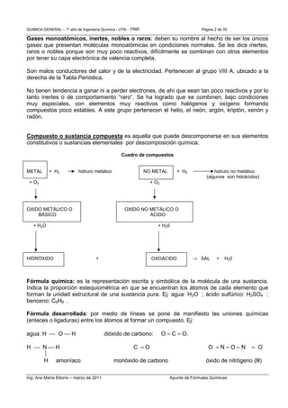 Este documento presenta información sobre fórmulas químicas, incluyendo la definición de elementos, compuestos y sus fórmulas. Explica que los elementos se representan con símbolos de 1 o 2 letras y se clasifican en metales, no metales y gases nobles. También describe cómo se forman los óxidos metálicos y no metálicos a partir de los elementos y cómo se representan y nombran sus fórmulas químicas.