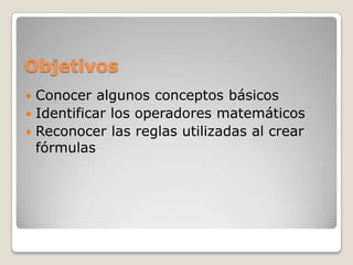 Este documento presenta conceptos básicos sobre fórmulas y funciones en Excel 2010, incluyendo referencias relativas y absolutas, operadores aritméticos, relacionales y lógicos, estructura y ejemplos de funciones como SUM y SUMIF. Además, explica elementos de las fórmulas como referencias de celdas, constantes y funciones, y proporciona una lista de categorías de funciones disponibles en Excel.