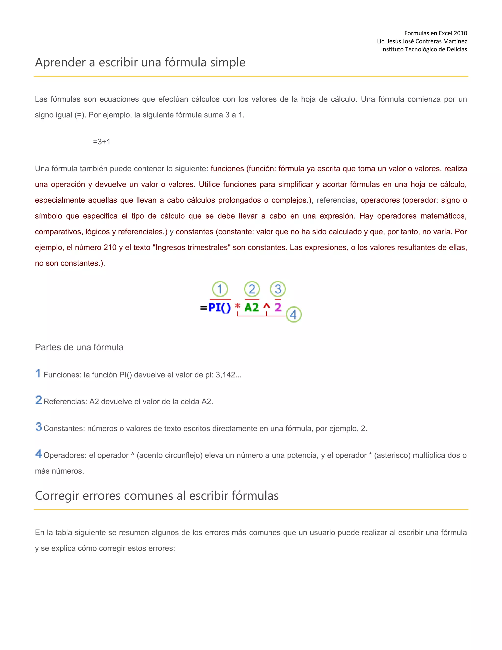 Este documento describe cómo escribir y corregir fórmulas en Excel 2010. Explica las partes básicas de una fórmula, como funciones, referencias, operadores y constantes. También detalla errores comunes al escribir fórmulas y cómo corregirlos, como asegurarse de que los paréntesis coincidan y usar el tipo correcto de argumentos. Además, explica cómo activar reglas para detectar errores en fórmulas como divisiones entre cero o fórmulas incoherentes.