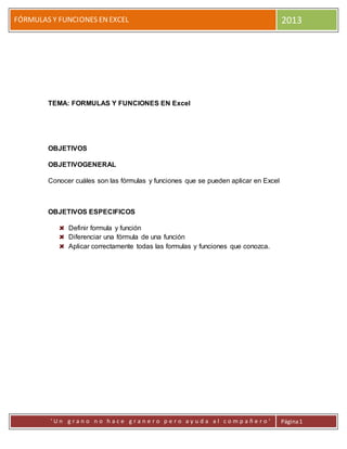 Este documento explica las fórmulas y funciones en Excel 2013. Define fórmula y función, y diferencia entre ellas. Explica los componentes de una fórmula en Excel como referencias de celdas, constantes, operadores y funciones. También describe los diferentes tipos de operadores y el orden en que Excel evalúa las operaciones en las fórmulas.