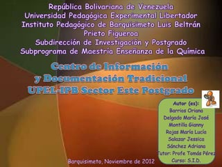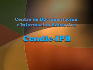 El CENDIE-IPB tiene como misión brindar apoyo con información especializada en educación de manera organizada y actualizada a las actividades de investigación y postgrado de la UPEL, propiciando la difusión y uso de la información para incrementar el conocimiento. Cuenta con más de 3,200 libros, 3,000 trabajos de grado y 232 publicaciones periódicas. Los usuarios pueden acceder a los recursos siguiendo sencillos pasos que incluyen la búsqueda en el catálogo en línea y la solicitud del material físico median