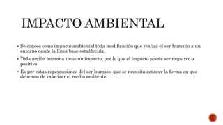 El documento discute los conceptos de impacto ambiental, valoración ambiental, externalidades, y bienes públicos. Explica que toda acción humana tiene un impacto ambiental y que es importante valorar los recursos naturales. También describe métodos para valorar activos ambientales como los costos evitados y el método de valoración contingente.