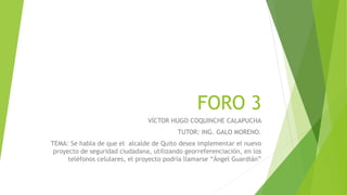 El alcalde de Quito desea implementar un nuevo proyecto de seguridad llamado "Ángel Guardián" que utilizaría georreferenciación en teléfonos celulares. Este sistema permitiría a los ciudadanos acceder gratuitamente a tecnología para recibir ayuda rápida ante emergencias a través de alertas a la policía, bomberos, ambulancias y contactos registrados. El proyecto usaría el GPS en los teléfonos para ubicar a las personas y combatir la inseguridad de manera más eficiente.