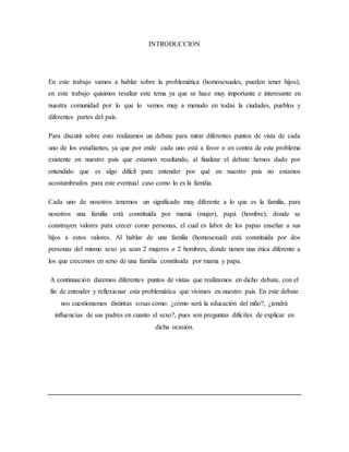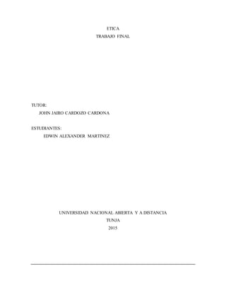 Este documento presenta un trabajo final sobre ética realizado por Edwin Alexander Martínez para la Universidad Nacional Abierta y a Distancia en Tunja, Colombia en 2015. El trabajo aborda la problemática de si las parejas homosexuales pueden adoptar hijos, un tema controvertido en la sociedad colombiana. Los estudiantes realizaron un debate sobre el tema y consideraron diferentes puntos de vista.