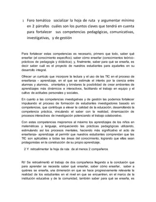 Para fortalecer sus competencias pedagógicas, comunicativas, investigativas y de gestión, el autor propone: 1) Enseñar conociendo el contenido específico, los métodos pedagógicos y objetivos de aprendizaje de los estudiantes. 2) Ofrecer un currículo que incorpore lectura, TIC, ciencia y trabajo en equipo. 3) Fortalecer la investigación de estudiantes mediante el desarrollo de competencias prácticas y colaborativas que mejoren la calidad educativa.