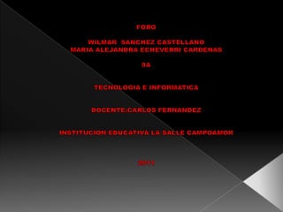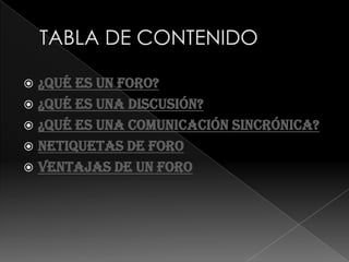 El documento habla sobre los foros, discusiones, comunicación sincrónica y netiquetas. Explica que un foro es una aplicación web que permite discusiones en línea sobre temas de interés común, y que las discusiones implican intercambiar opiniones sobre un tema o problema. También describe la comunicación sincrónica como el intercambio de información en tiempo real a través de Internet, y las netiquetas como las reglas de comportamiento para participar en foros u otros espacios de comunicación en línea. Finalmente, resalta algunas