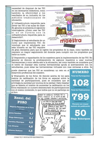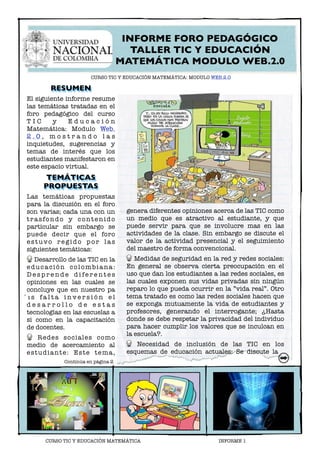 El documento resume las discusiones de un foro pedagógico sobre el uso de las TIC en la educación matemática. Los temas discutidos incluyen el desarrollo de las TIC en Colombia, el uso de redes sociales para acercarse a los estudiantes, y la necesidad de incluir las TIC en la educación actual considerando la infraestructura y capacitación docente requerida. El foro contó con la participación de 102 personas y 799 publicaciones.