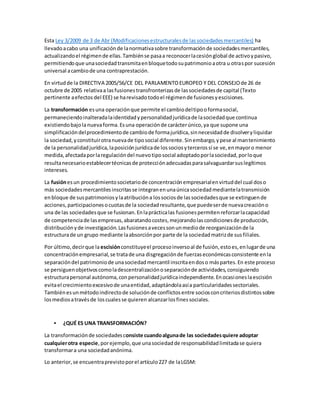 Este documento explica las transformaciones, fusiones y escisiones de compañías en España. Brevemente: