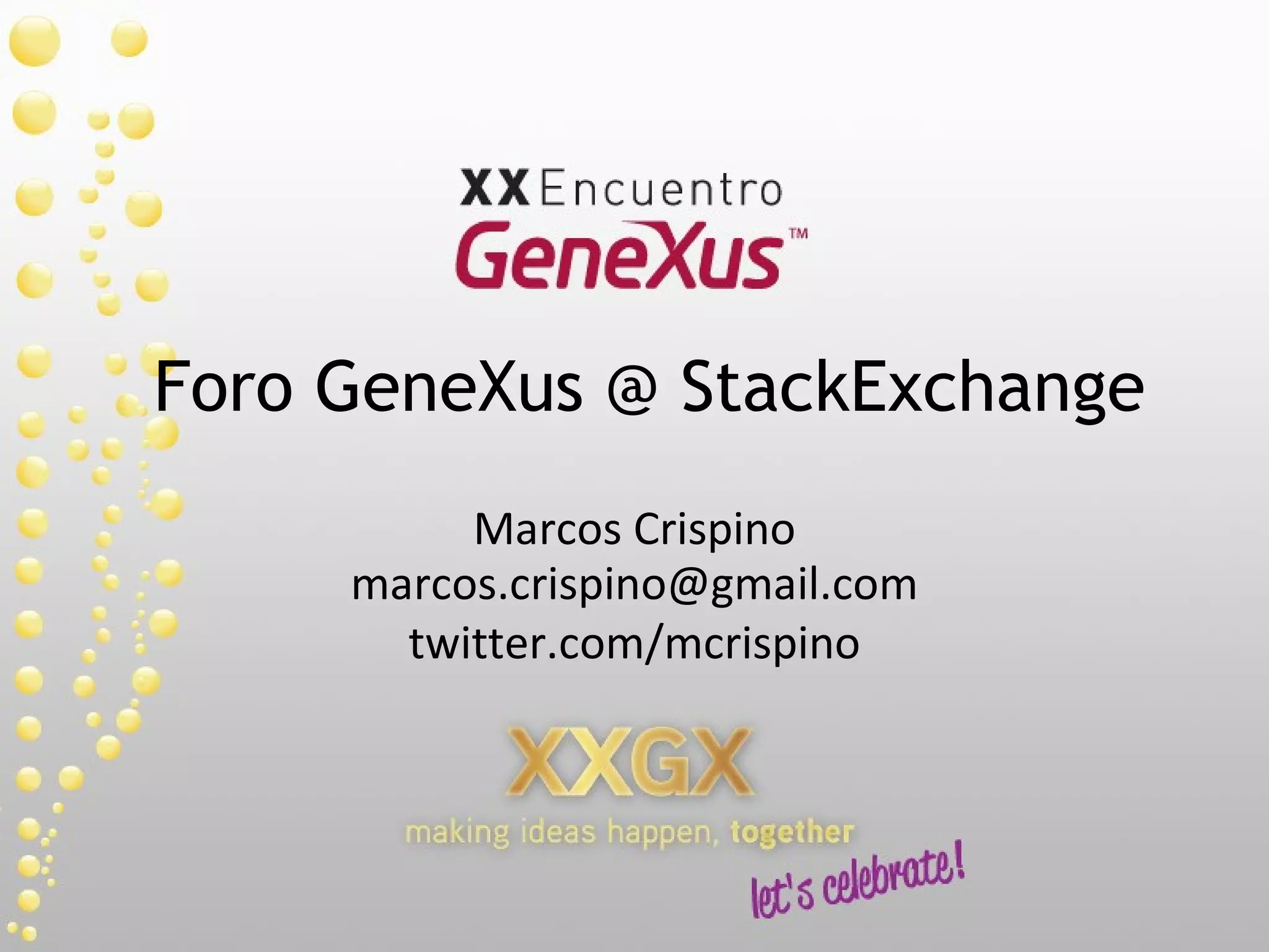 Este documento habla sobre la propuesta de crear un foro de GeneXus en StackExchange. Explica que StackExchange alberga sitios de preguntas y respuestas basados en méritos como StackOverflow. La propuesta de GeneXus debe ser aprobada por la comunidad en el sitio Area 51 de StackExchange mediante votos y seguidores. Se invita a la gente a registrarse en Area 51 para apoyar la propuesta de GeneXus.