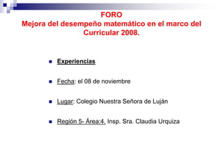 Este documento describe un foro matemático que se llevará a cabo para compartir experiencias innovadoras que hayan mejorado el desempeño matemático de acuerdo con el Curricular 2008. Se invita a docentes de escuelas de la región a presentar ponencias de hasta 3 páginas describiendo una experiencia, la cual expondrán en el foro en un máximo de 15 minutos. El foro tendrá lugar el 8 de noviembre en el Colegio Nuestra Señora de Luján.
