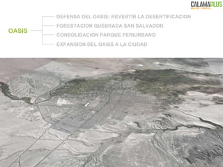 El documento propone varias iniciativas para proteger y expandir el oasis de Calama, incluyendo la consolidación de un parque periurbano, la forestación de la quebrada de San Salvador, la modificación del límite urbano, la expansión agrícola, la protección de comunidades indígenas, la desocupación de tomas ilegales y la creación de una red verde.