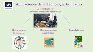 El documento describe las aplicaciones de la tecnología educativa, incluyendo herramientas electrónicas y no electrónicas, y cómo la tecnología ha cambiado el papel del docente de ser la fuente del conocimiento a ser un tutor y facilitador del aprendizaje del estudiante, permitiéndole establecer su propio ritmo de trabajo. También introduce el concepto de Espacios Virtuales de Aprendizaje.