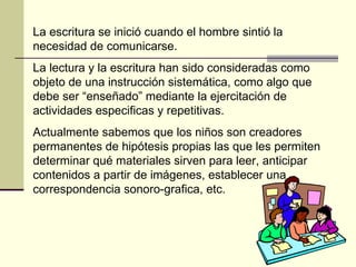 El documento habla sobre el uso de la tecnología en las aulas de primer grado. Explica que la lectura y escritura deben enseñarse de manera sistemática mediante actividades repetitivas. También menciona que las TIC son importantes para alfabetizar digitalmente a los estudiantes, aumentar la productividad y la innovación metodológica. Propone un proyecto pedagógico basado en el uso de las TIC como el karaoke interactivo y el procesador de texto para estimular las habilidades de lecto-escrit
