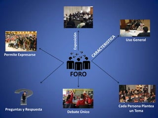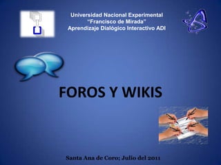 El documento describe dos herramientas de comunicación en línea, foros y wikis. Los foros permiten que cada persona plantee un tema y debatan preguntas y respuestas sobre ese tema. Las wikis permiten que varios usuarios trabajen juntos para crear contenido de forma colectiva. El documento instruye a los estudiantes a ingresar a su plataforma de aprendizaje en línea y participar en un foro respondiendo una pregunta planteada.