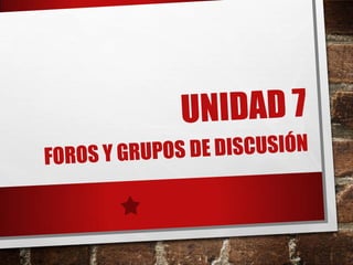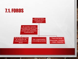 El documento habla sobre diferentes tipos de foros y grupos de discusión en Internet. Explica cómo funcionan los foros como Stack Overflow donde los usuarios pueden publicar temas y respuestas. También describe los grupos de discusión que surgieron en universidades para permitir el intercambio de mensajes entre usuarios sobre temas específicos. Finalmente, menciona las listas de distribución de correo electrónico que agrupan direcciones para enviar mensajes a múltiples personas.