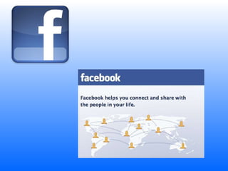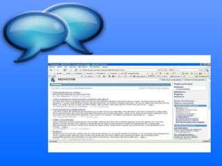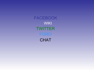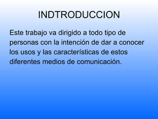 Este documento presenta una introducción a diferentes medios de comunicación como Facebook, Wiki, Twitter, foros y chat, describiendo brevemente su historia, uso y características principales. Facebook comenzó como una red para estudiantes de Harvard y ahora permite a cualquier persona con una cuenta de correo electrónico unirse. Wiki permite que múltiples voluntarios editen su contenido en línea de manera colaborativa. Twitter es una red de microblogging donde los usuarios pueden seguirse unos a otros. Los foros son para debates en grupo sobre temas de interés donde el contenido