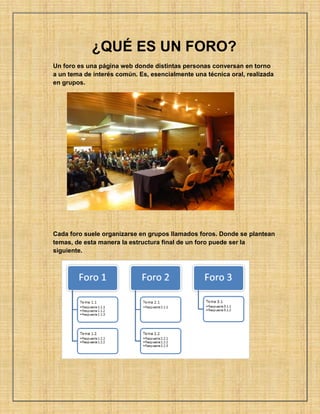 Este documento define y explica los conceptos de foro y grupo de discusión. Indica que un foro es una página web donde personas conversan sobre un tema de interés común de manera similar a una discusión oral en grupo. Explica que los foros permiten abrir debates donde la gente aporta ideas sobre un tema y que también permiten comunicarse e intercambiar información. Finalmente, define un grupo de discusión como un foro en línea donde los participantes opinan agregando mensajes de texto.