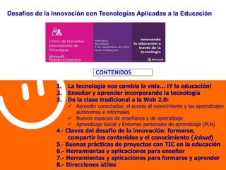 Este documento describe los desafíos de la innovación educativa mediante el uso de tecnologías. Explica cómo las TIC están cambiando la vida de las personas y la forma de enseñar y aprender, pasando de un modelo tradicional y lineal a uno más social, colaborativo e informal basado en internet y las herramientas web 2.0. Finalmente, señala algunas claves para afrontar con éxito este cambio como la formación del profesorado y el acceso a recursos digitales de calidad.