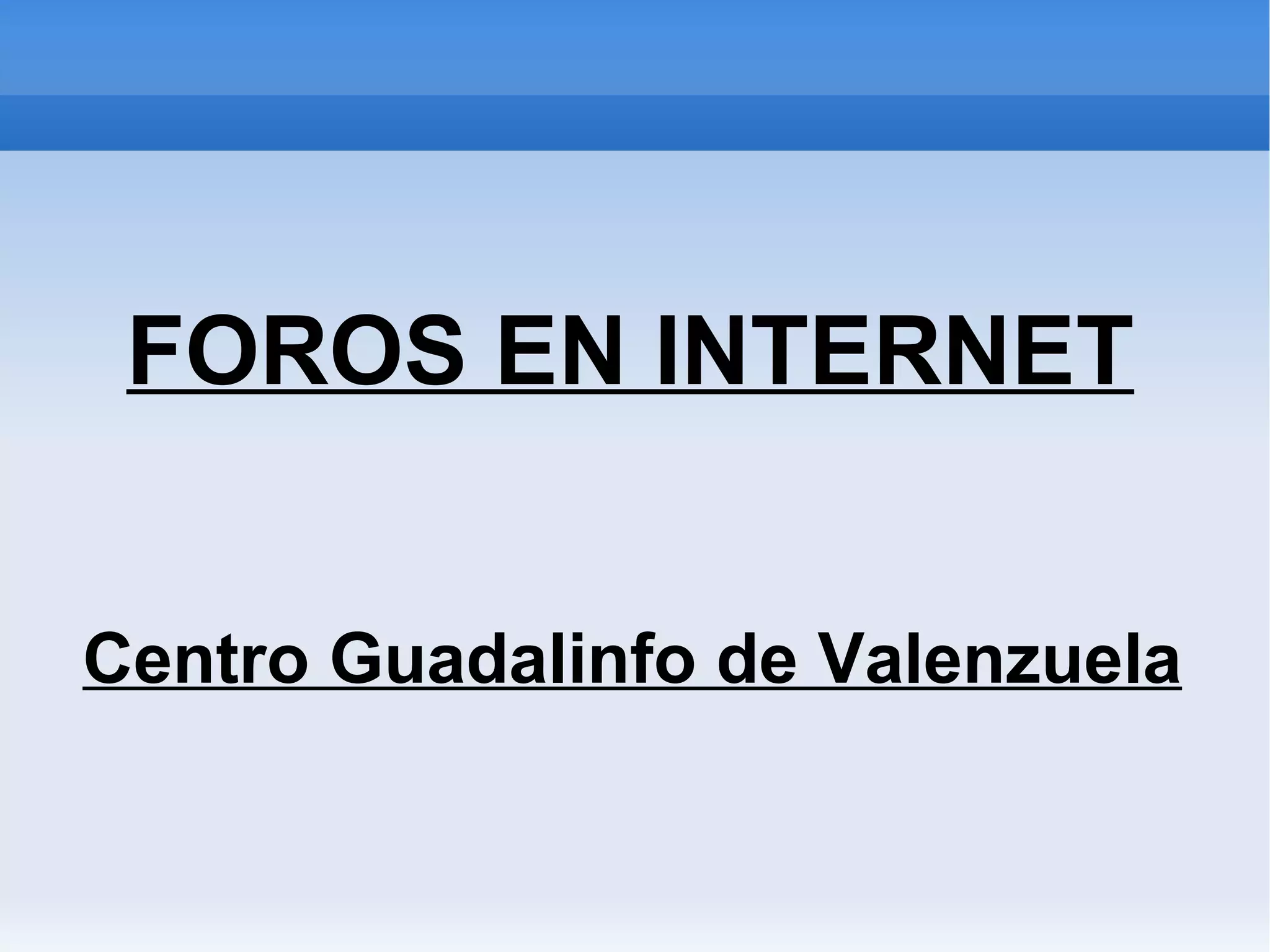 El documento describe los foros en internet, incluyendo su definición como un grupo de personas que intercambian información y opiniones en línea sobre diversos temas. Explica los tipos de foros, cómo participar en ellos, las normas y roles como el moderador, y características como las discusiones en tiempo diferido y el uso de emoticonos. Finalmente, proporciona algunas direcciones de foros para practicar la participación.