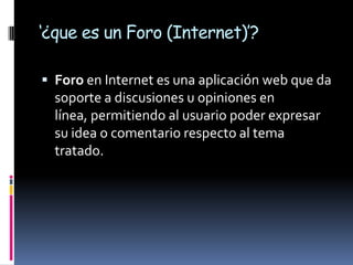 Un foro en línea es una aplicación web que permite a los usuarios expresar ideas y comentarios sobre un tema. Los foros se desarrollan comúnmente en PHP, Perl, ASP.NET o Java y almacenan datos en bases de datos SQL o archivos de texto. Algunos sistemas populares de foros son phpBB, vBulletin y MyBB. Los principales problemas que enfrentan los foros son el spam, los trolls y los usuarios que solo buscan aprovecharse sin contribuir.