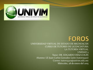 El documento aborda la importancia de los foros virtuales en el aprendizaje colectivo, destacando su organización, temáticas, y diferentes tipos como foros de investigación y debate. Se enfatiza el papel activo del docente en la moderación y evaluación de la participación, resumiendo los factores que pueden obstaculizar el éxito de estos espacios. Además, se mencionan las ventajas y desventajas de la tecnología en estos entornos educativos y la necesidad de fomentar la interactividad entre estudiantes y docentes.