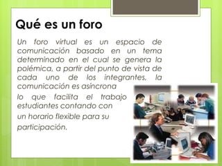 Este documento describe los foros de intercambio y debate, incluyendo qué son los foros virtuales, sus usos como el debate, y posibles problemas y soluciones. Los foros permiten el aprendizaje grupal a través de la participación asincrónica y desde diferentes perspectivas. Aunque se usan principalmente para el debate, es importante la participación del tutor para evitar problemas como la sobrecarga de información.