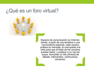 Este documento describe las competencias clave de un tutor virtual efectivo. Explica que un foro virtual es un espacio en línea para comunicación y debate sobre un tema. Detalla diferentes tipos de foros como de discusión, investigación y consulta. También destaca la importancia de que el tutor participe de manera activa pero medida para estimular el debate sin dominarlo, y ofrezca retroalimentación constructiva que haga dudar a los estudiantes y compare ideas.
