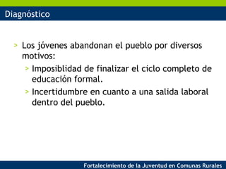 Este documento describe un proyecto para fortalecer a la juventud en comunas rurales. Actualmente, los jóvenes abandonan sus pueblos debido a la falta de educación y oportunidades laborales. Cuando llegan a las ciudades, enfrentan desarraigo familiar y decepción por las limitadas opciones de empleo. El objetivo del proyecto es generar capacitaciones y proyectos para fomentar la permanencia de los jóvenes en sus pueblos, cubriendo áreas como formulación de proyectos, gestión, economía