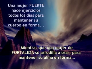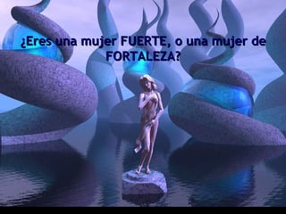 El documento contrasta las características de una mujer fuerte versus una mujer de fortaleza. Mientras una mujer fuerte se enfoca en su propia confianza y fuerza, una mujer de fortaleza demuestra valor a través de su fe en Dios, da lo mejor de sí misma a los demás, y aprende de sus errores. El documento concluye orando a Dios para que les enseñe a ser mujeres de fortaleza.