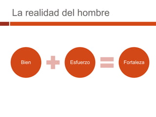 Este documento describe la virtud moral de la fortaleza y sus facetas. Explora la diferencia entre acometer y resistir desafíos, y cómo la fortaleza puede manifestarse tanto de forma positiva al emprender grandes tareas, como de forma pasiva al soportar el dolor o la desesperanza. También distingue entre cobardía, valentía y temeridad, señalando que el valiente siente miedo pero lo somete a la razón. Finalmente, ofrece consejos sobre cómo adquirir fortaleza a través del autodominio y enfrentar