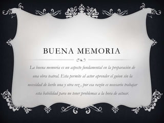 Los principales aspectos que fortalecen a un actor incluyen tener una buena memoria para aprender el guion sin necesidad de leerlo constantemente, ser sensible para expresarse de manera humana y trascendental, identificarse con el personaje para pensar y actuar como él de forma autónoma e improvisar, vocalizar correctamente las palabras para hacerse entender claramente por el público, y utilizar gestos corporales que enfatizan los pensamientos de una forma más humana.