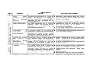 El documento resume los componentes, fortalezas y oportunidades de mejora de la gestión directiva de una institución educativa. Entre las fortalezas se encuentra que la institución cuenta con una misión, visión y principios claros, así como metas y políticas de inclusión establecidas. Entre las oportunidades de mejora están revisar y ajustar periódicamente la misión, visión y metas, y mejorar la articulación de planes, proyectos y acciones de la institución.