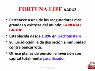 El documento describe los productos de inversión y jubilación ofrecidos por FORTUNA LIFE en Vaduz, Liechtenstein. Pertenecen al grupo asegurador GENERALI y ofrecen planes con capital totalmente garantizado. Los productos incluyen planes de pensión clásicos, inversiones a través de fondos mutuos, e inversiones únicas. Los planes de pensión ofrecen tasas de retorno garantizadas del 2.75% y protección legal en Liechtenstein.