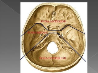 El documento describe tres partes anatómicas del cráneo humano: 1) la porción vertical del hueso frontal, el tubérculo de la silla y el borde posterior de las alas menores; 2) el límite posterior de la fosa craneal anterior, el dorso de la silla y el borde superior de la porción petrosa de los huesos temporales; y 3) el dorso de la silla, el borde superior de la porción petrosa del hueso temporal y los surcos de los senos transversos.