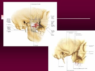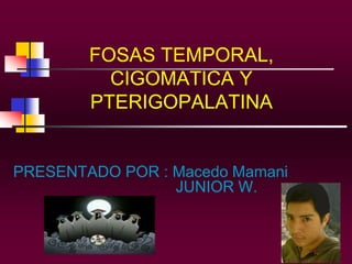 Este documento resume las características anatómicas de tres fosas del cráneo: la fosa temporal, la fosa cigomática e infratemporal, y la fosa pterigopalatina. Describe los límites, contenido y comunicaciones de cada una, incluyendo vasos sanguíneos, nervios y músculos. La fosa temporal contiene el músculo temporal y nervios craneales. La fosa cigomática contiene los músculos pterigoideos y la arteria maxilar. La fosa pterigopalatina contiene