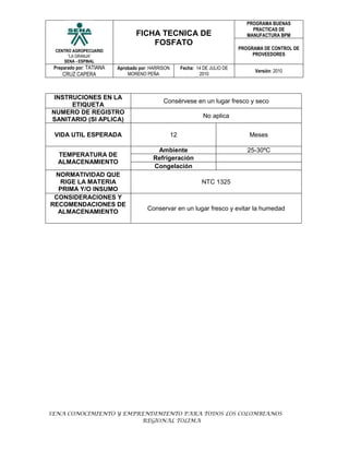 El documento describe las características del fosfato, un polvo blanco cristalizado que se obtiene de la roca fosfórica y se usa como estabilizante, emulsificante y para evitar la pérdida de agua. Se presenta en bolsas de polietileno de 1000g y debe almacenarse en un lugar fresco y seco, con una vida útil de 12 meses.