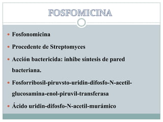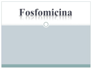 La fosfomicina es un antibiótico producido por Streptomyces que inhibe la síntesis de la pared celular bacteriana al bloquear la enzima fosforribosil-piruvsto-uridin-difosfo-N-acetil-glucosamina-enol-piruvil-transferasa. Tiene actividad contra bacterias grampositivas y su biodisponibilidad oral es del 40%, distribuyéndose principalmente en el aparato genitourinario y respiratorio con una semivida de 2 horas y siendo eliminado en un 90% a través